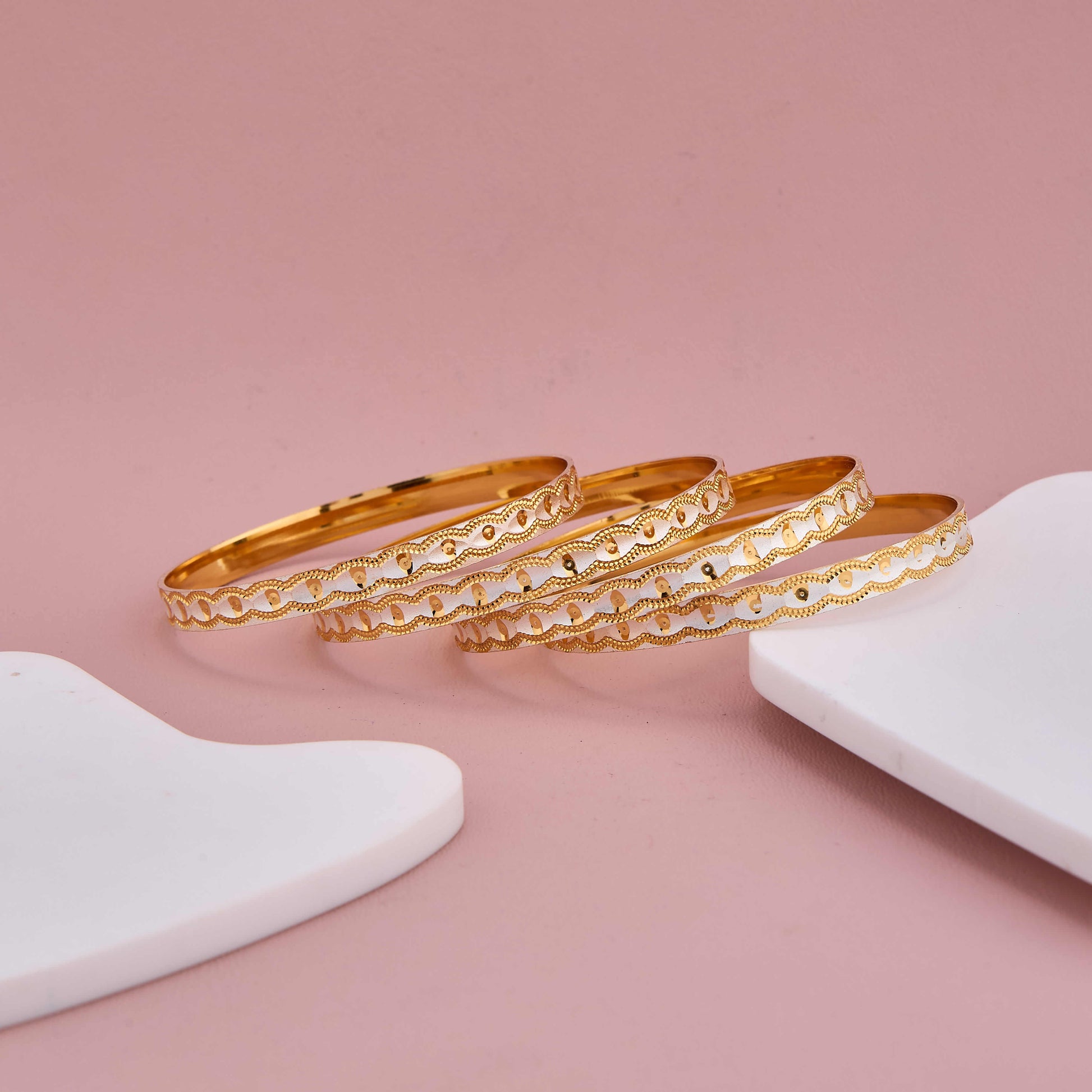 Add charm to your style with these beautifully designed gold and white bangles, featuring a delicate wavy loop pattern. The dual-tone design highlights the elegance of gold, enhanced by the subtle white detailing, giving the bangles a unique artistic appeal.
