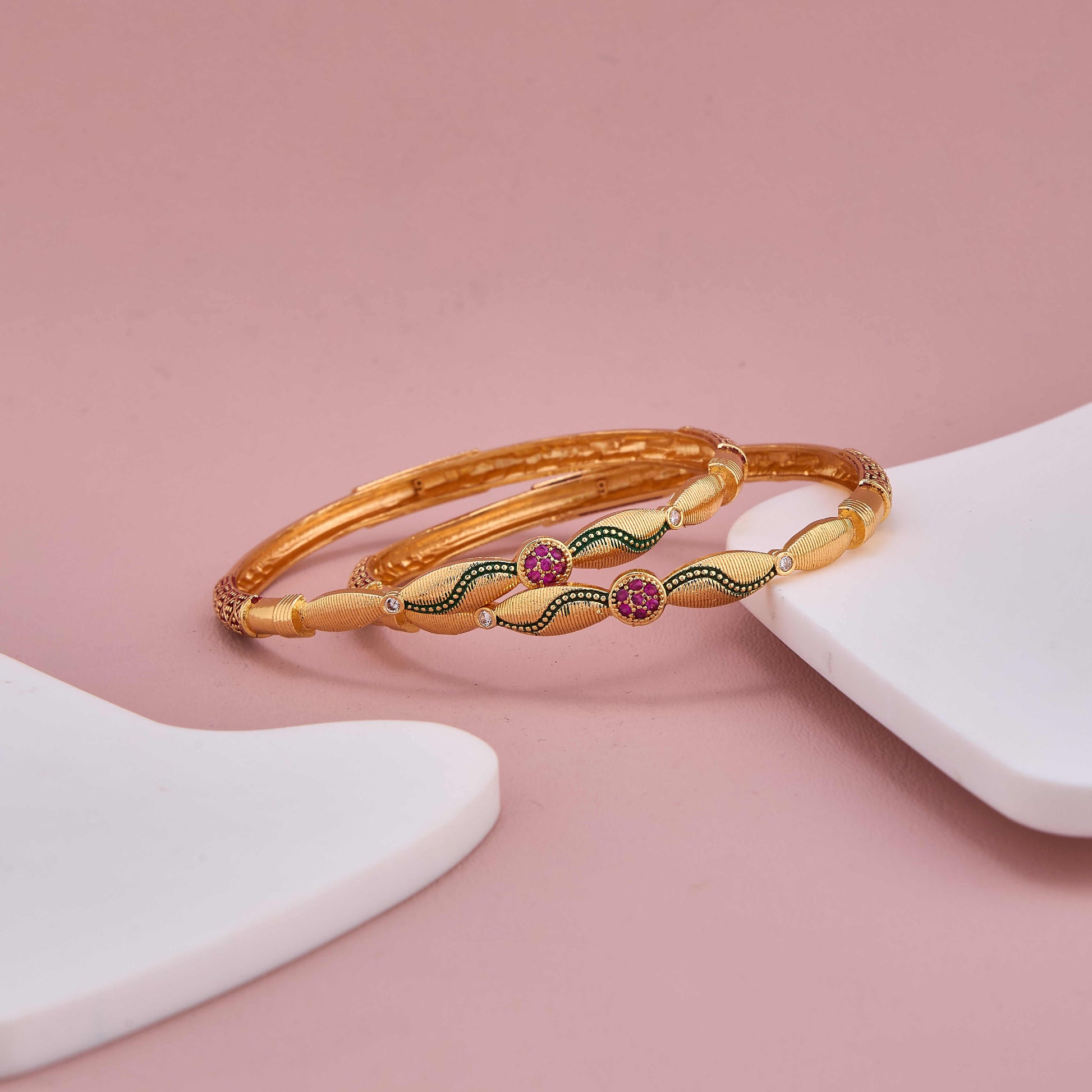 This set of 2 gold-plated bangles is designed with a graceful wavy pattern that symbolizes elegance and flow. The intricate detailing in green accents adds a refreshing charm, perfectly balanced with the radiant golden finish.
