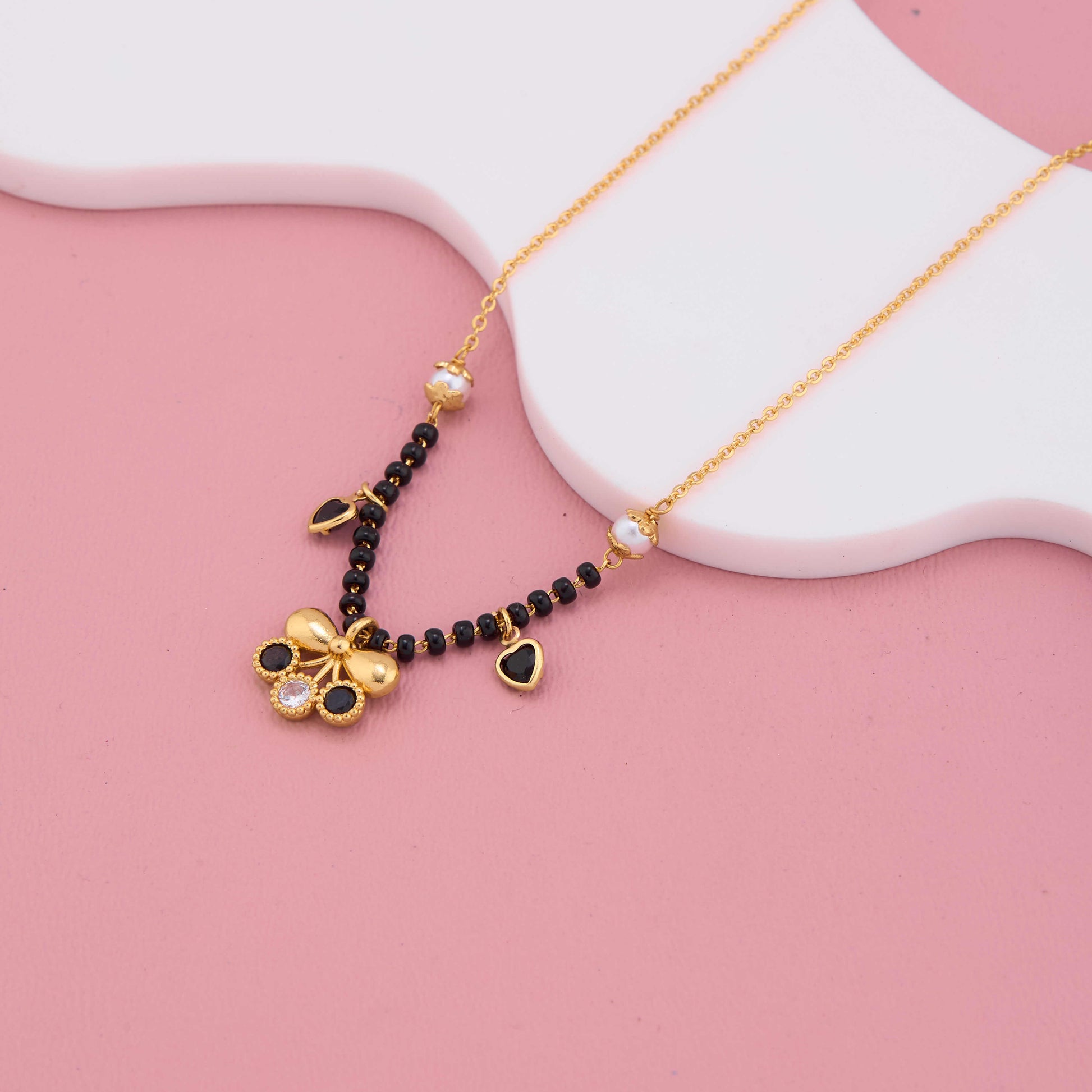 This gold-plated mangalsutra is a perfect blend of tradition and modern elegance. The delicate chain is enhanced with black artificial stones on the strand, giving it a graceful and timeless touch.