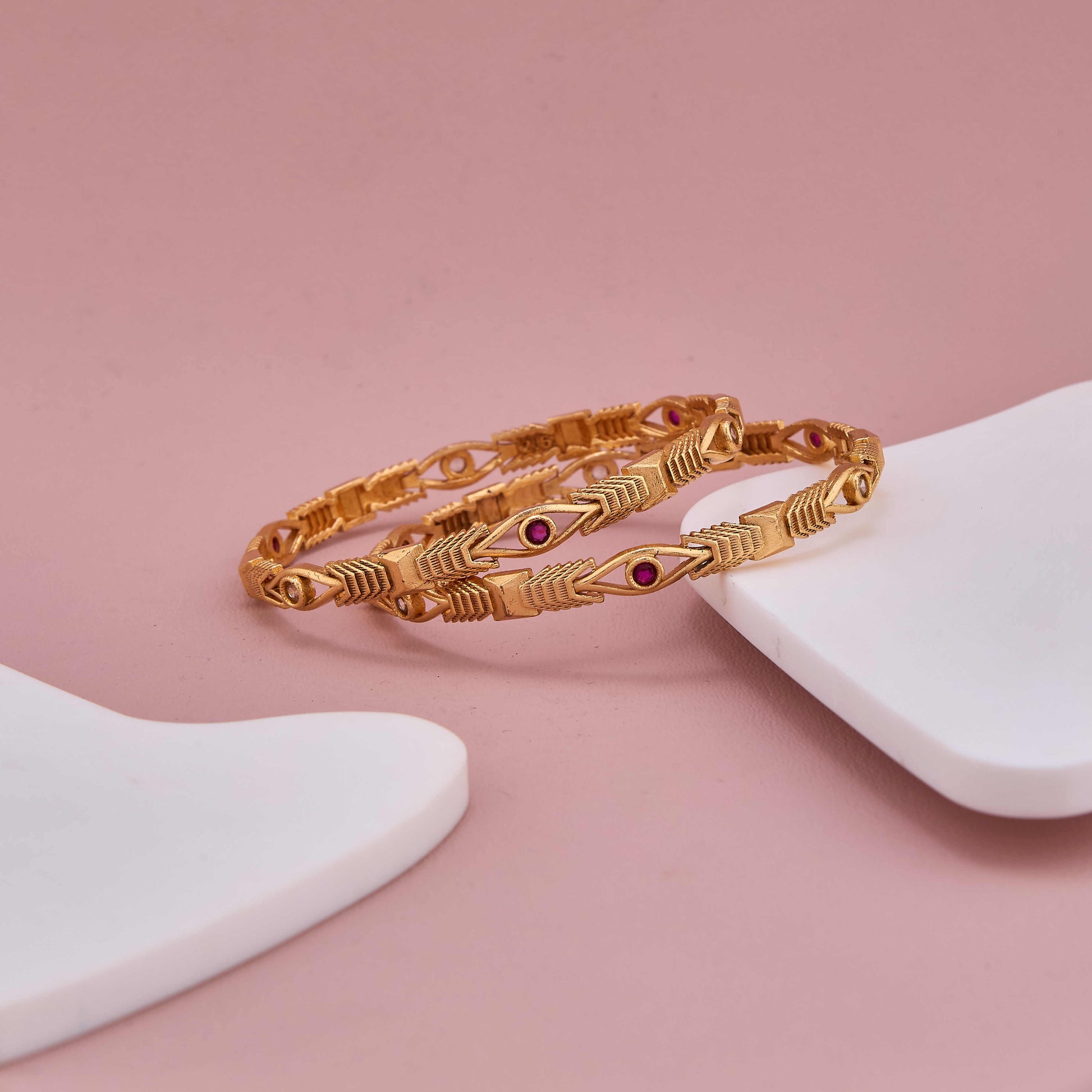 This gold-plated bangle set of two is crafted with fine detailing and adorned with vibrant artificial stones, adding a hint of sparkle to your wrists. The unique design combines elegance and tradition, making it a perfect accessory for everyday wear or festive occasions.