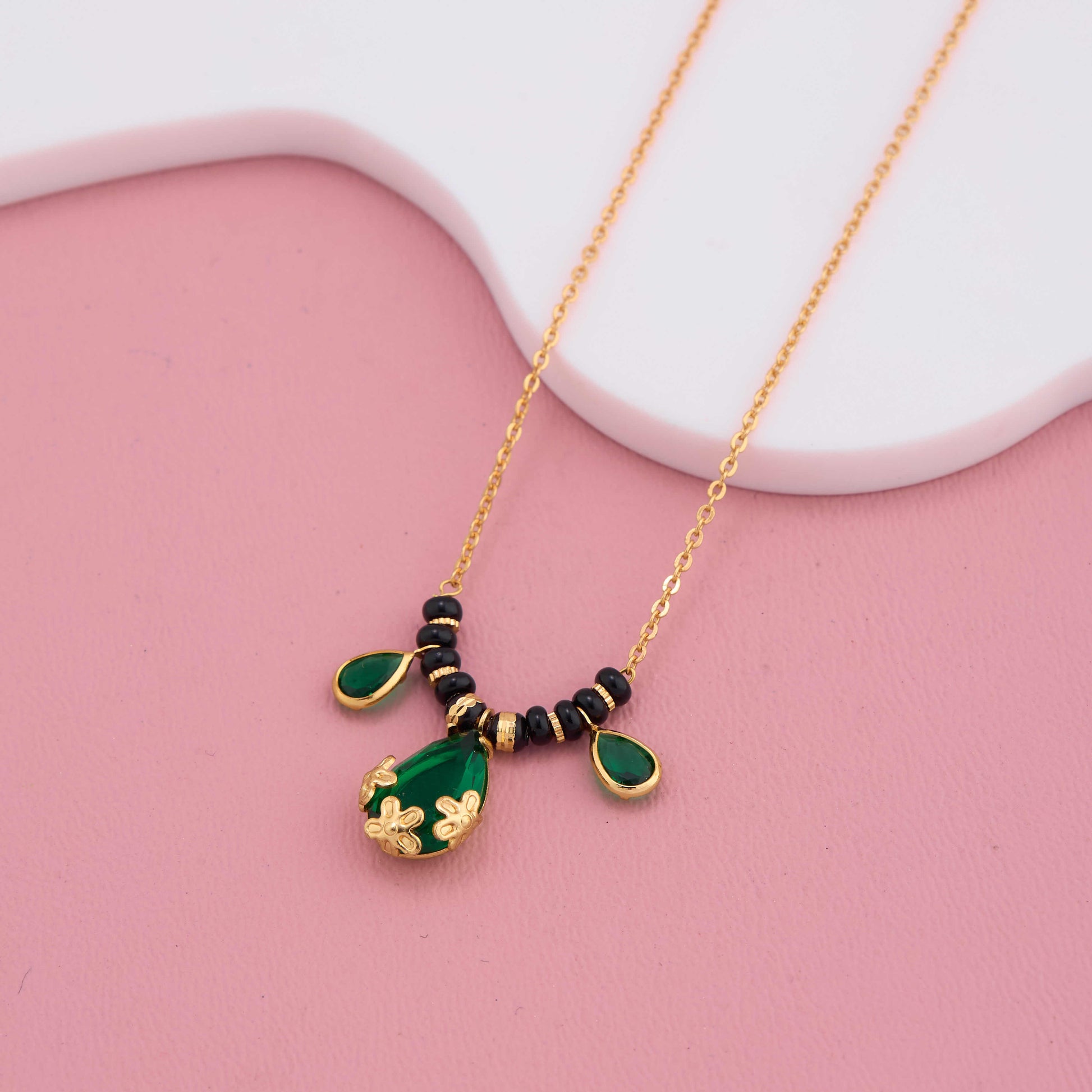 This exquisite gold-plated mangalsutra features a striking green teardrop-shaped American diamond pendant, delicately accented with floral detailing. The side drops enhance its graceful appeal, creating a design that symbolizes growth, prosperity, and harmony.