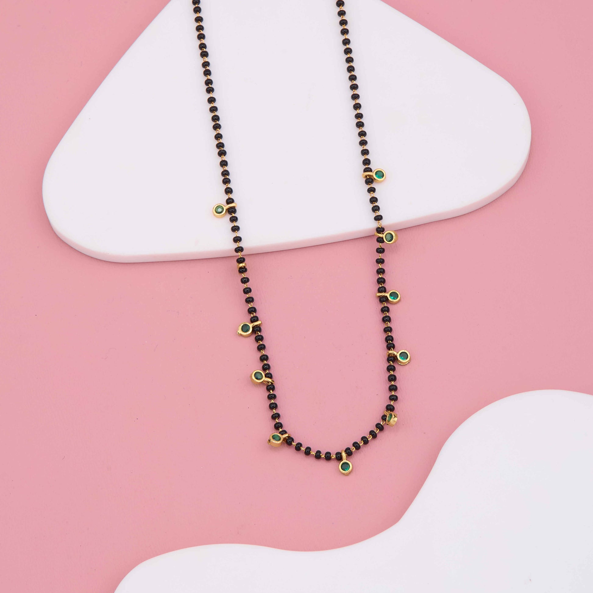 This graceful gold-plated mangalsutra combines timeless elegance with a touch of modern charm. The delicate black bead strand is adorned with striking green artificial stones, adding a vibrant pop of color to the traditional design. Perfect for everyday wear, this piece reflects both simplicity and sophistication.