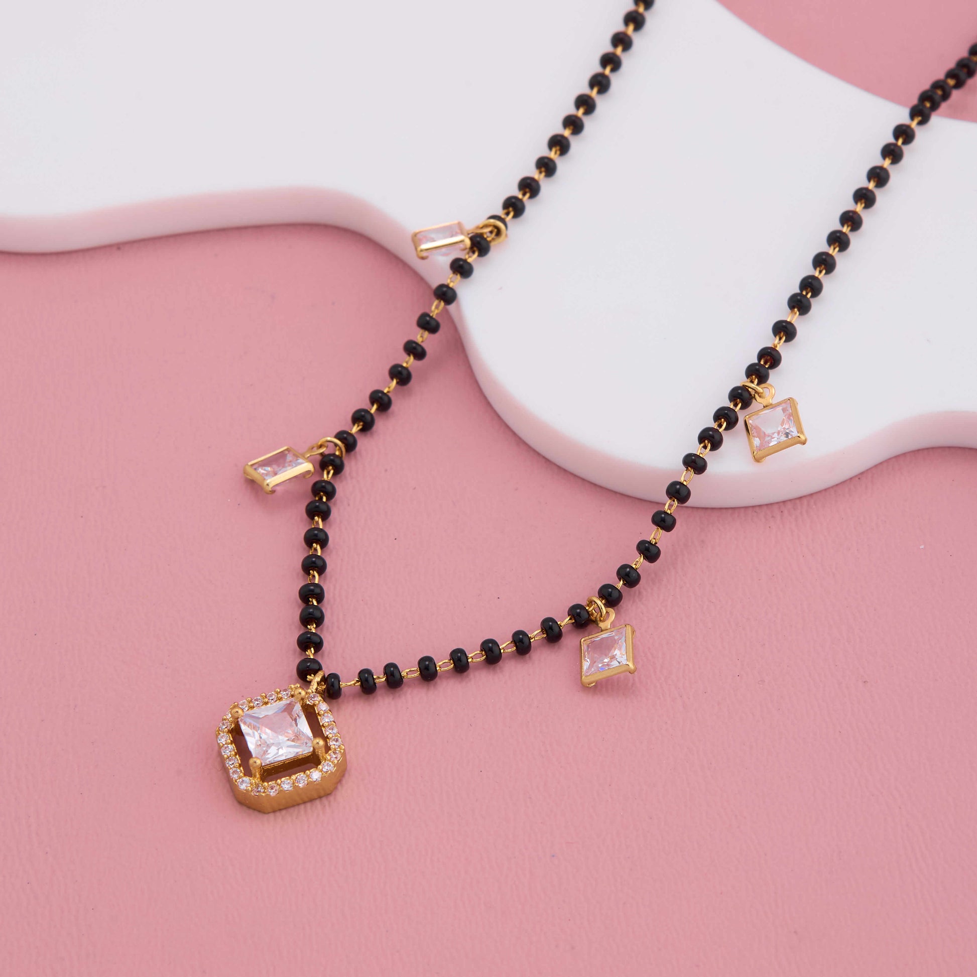 The centerpiece features a dazzling square-shaped pendant framed with shimmering stones, while matching square American diamonds are placed along the strand for added brilliance. With its elegant design and lasting shine, this mangalsutra is a timeless symbol of love and grace.