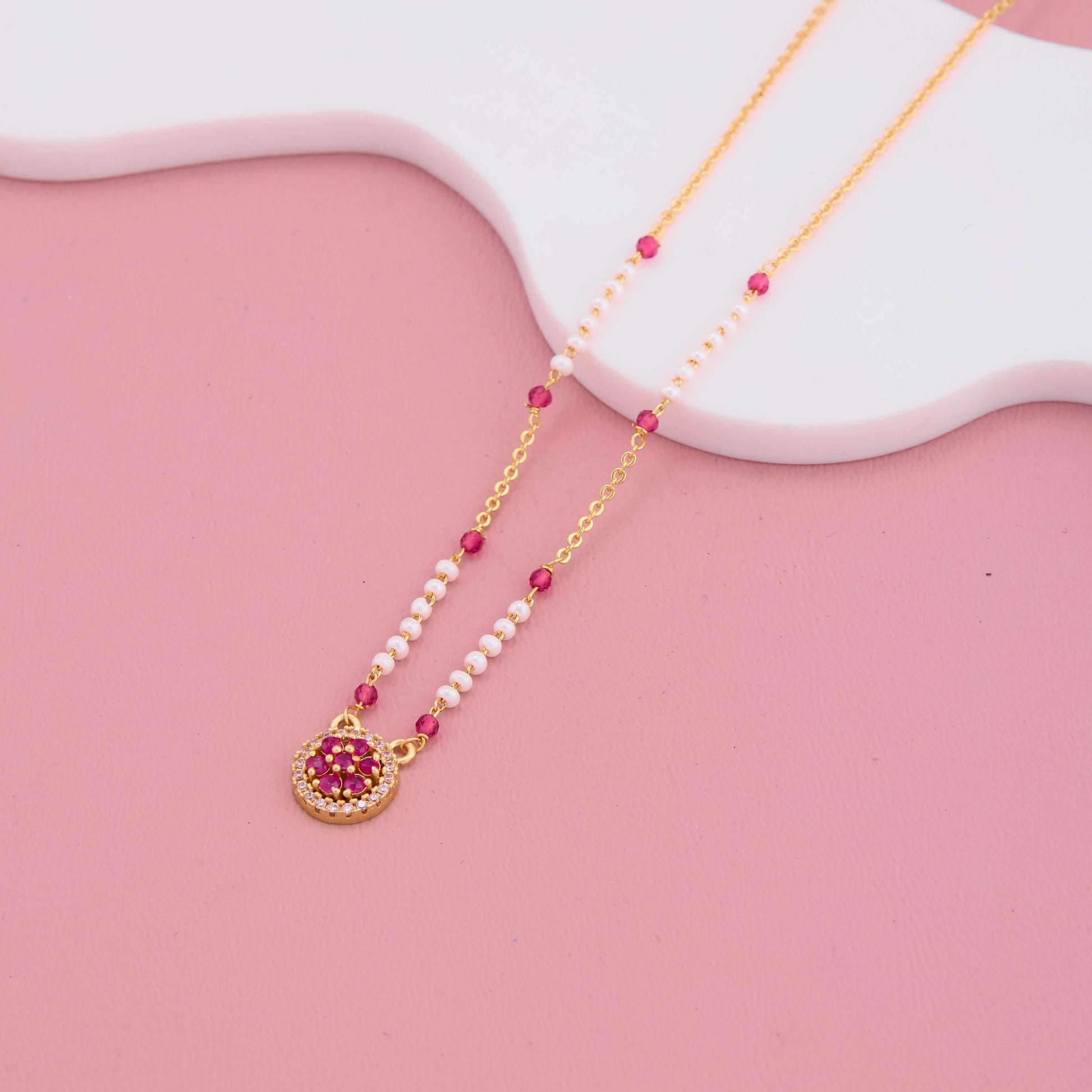 This graceful mangalsutra features a stunning round pendant adorned with maroon artificial beads at the center, encircled by sparkling American diamonds. The unique blend of bold maroon and shimmering diamonds creates a rich and elegant design, perfect for women who love timeless sophistication.